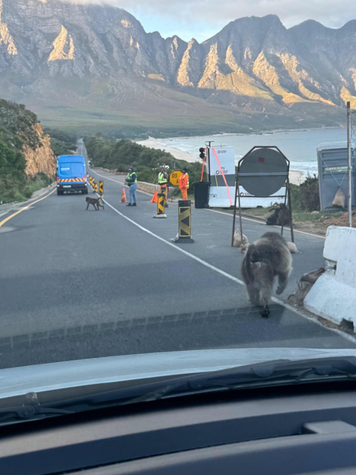 We had one slight detour, getting out of town, but generally, we got to Betty’s Bay without a glitch. During the hour and a half drive there, much of it was on a large highway similar to our interstate system. Once we got off the motorway, we drove through a very wealthy area. It was full of golf courses, grand gated estates, wide sidewalks, decorated lawns, and huge houses with views of the ocean beyond. The last 15 miles or so were on a two lane curvy road on the edge of the ocean, similar to highway one in California. There were rocky hillsides directly to our left and ocean vistas with signs to look for whales just to our right. Baboons blocked our progress only once, but construction crews blocked it many more times. Apparently, as winter is the low travel season, it must also be the season that roadwork is completed.